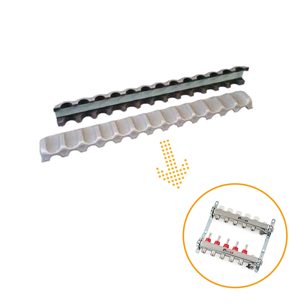 Forro aislante para colector inoxidable. Fabricado en dos mitades con sistema autoadhesivo para su montaje. Cada forro aislante dispone de espacios para 12 salidas más 1 adicional para las válvulas de llenado/vaciado y purgador.