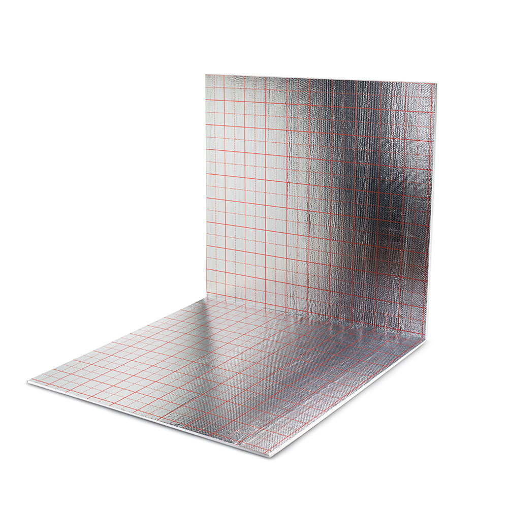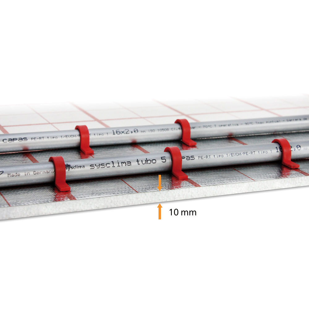 La placa ALU-PS 10 fabricada según EN-13163 está compuesta por 10 mm de poliestireno expandido y un film protector aluminizado muy resistente a la rotura que sirve a la vez de barrera antivapor y lámina difusora. El film está reforzado con un entramado de fibras para mejorar la sujeción de las grapas. Las placas disponen de una solapa autoadhesiva de 30 mm en un lateral, provista de una cinta protectora para evitar el secado del adhesivo durante el almacenamiento de las placas y que facilita la unión entre ellas. Para las uniones de los laterales restantes se deberá utilizar la cinta adhesiva para placas (Ref. 133 600 132). La cuadrícula serigrafiada sobre el film protector marca una distancia de 50 mm que sirve de guía para facilitar la distribución del tubo. Para mejorar su transporte y manipulación, las placas se suministran plegadas por el centro. Sus medidas permiten así una colocación rápida y sencilla.