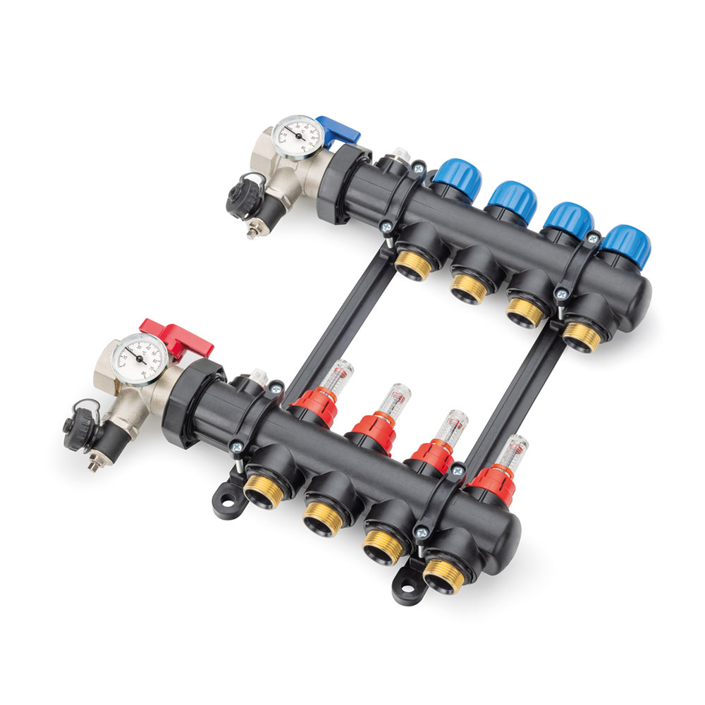 El Colector Sysclima PA está diseñado como un bloque compacto fabricado en Poliamida, un material de alta resistencia mecánica que debido a sus características técnicas funciona como un aislante térmico. Es ideal para instalaciones de suelo radiante frío y calor. Está equipado con válvulas termostatizables rosca M30 x 1,5 en el retorno, caudalímetros en la ida para regulación y visualización del caudal, salidas en ¾» con rosca tipo euro-cono, purgador manual en ida y retorno y soportes en material plástico con sus correspondientes abrazaderas. El colector se suministra con válvulas de corte para ida (roja) y retorno (azul) que incluyen ambas, tanto termómetro como válvula de llenado y vaciado. La conexión de las válvulas de corte es de 1″.