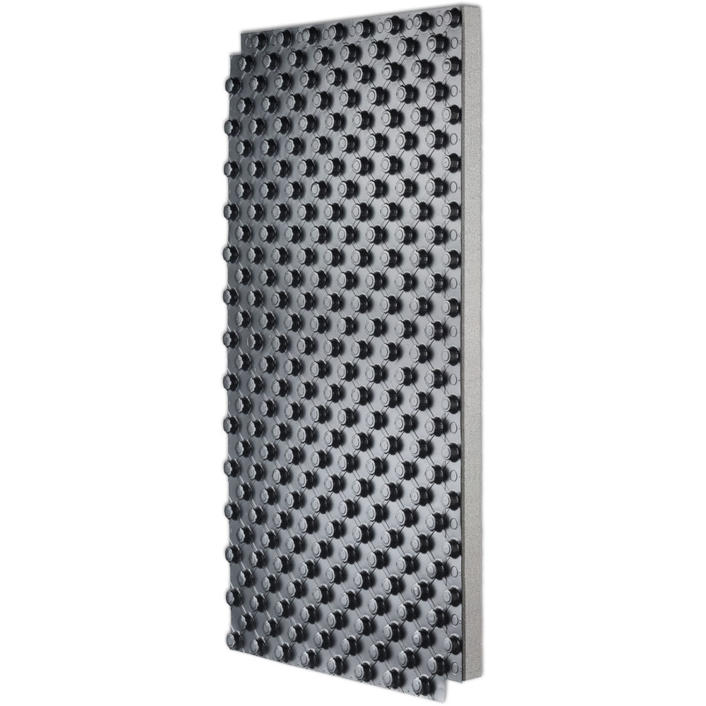 Placa de nopas termoconformada según EPS EN-13163 compuesta por una base de poliestireno expandido grafitado moldeado y con una lámina plástica por su parte superior encajada en las nopas de EPS grafitado. Esta lámina de plástico actúa de barrera antivapor y de soporte para los tubos aportando a una importante resistencia mecánica a la placa.